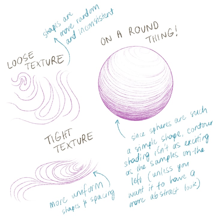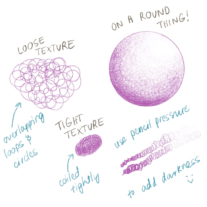 Using many loops and circles to create a textured shade. The smaller and neater the circles, the more controlled and detailed the work. The larger and further apart the circles, the looser and more freeform the result.