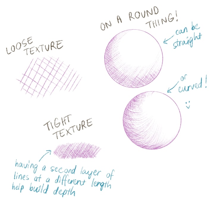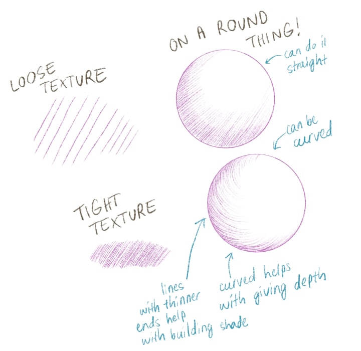Before we look at each technique in detail, keep in mind that very basically, shading is about how much of the paper (assuming you’re working on paper) is showing through your work. This means your surface and tool choices matter — rough paper will show more through your shading and will give it a looser and rougher look, and smoother paper is easier to do tightly defined shading on (but if the paper is too smooth, like layout or bleedproof paper, it’ll likely give pencil works a shiny finish and won’t be able to take as much pencil pressure). This is not to say that one surface or tool is better than another, but more to keep in mind that using appropriate material makes it easier for you to troubleshoot and self-critique your work. Experimenting with different surfaces and materials is always recommended :)