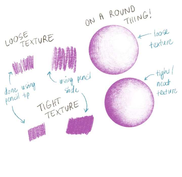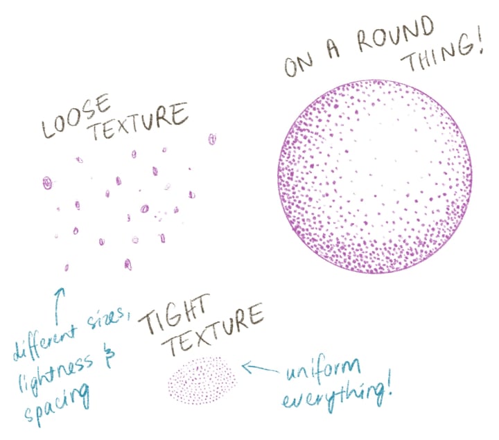 Scumbling is great for shading surfaces that have a mild to medium texture, like skin or fruit. The slight unevenness emulates the slight imperfections that natural surfaces have, even in really detailed drawings. The drawback of scumbling is that it takes a long time! You have to either be really patient or just really enjoy the scumbling process.
