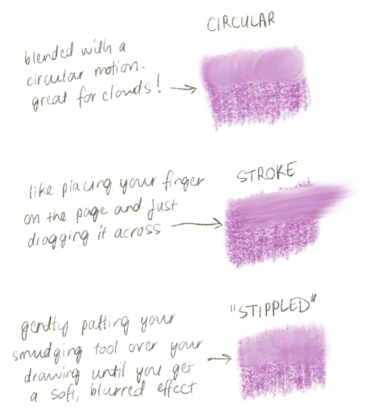 You can use plenty of different tools to smudge, like the tip of your finger, a soft eraser, Q-tips, cloth, tissues, or brushes. It’s generally recommended not to use your finger to smudge, since the oils in our skin can make it hard to erase later. You can use different movements to get different effects as well — smudging in small circular motions will have a different look to dragging the pigment out in long lines, for example.