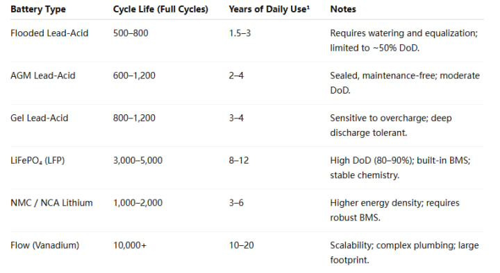 Drawing more of a battery’s capacity each cycle shortens its life. Lead‑acid is typically limited to 50% DoD, whereas LiFePO₄ can safely handle 80–90%.