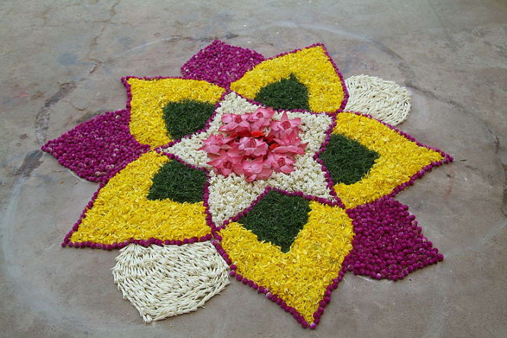 Rangoli is an art form, originating in the Indian subcontinent, in which patterns are created on the floor or the ground using quartz powder[1] materials such as colored rice, colored sand or flower petals. It is usually made during Diwali or Tihar, Onam, Pongal and other Hindu festivals in the Indian subcontinent. Designs are passed from one generation to the next, keeping both the art form and the tradition alive.