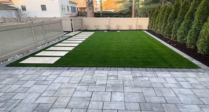 A basic square backyard can be transformed into a contemporary space with a unique landscaping design that includes beautiful dimensions. The artificial turf acts as the main focal point, with the other features offering contrasting shades and textures. Concrete pavers, evergreen plants, stone patios, and cream-colored fences create a clean design that makes the green lawn the focal point of the backyard.