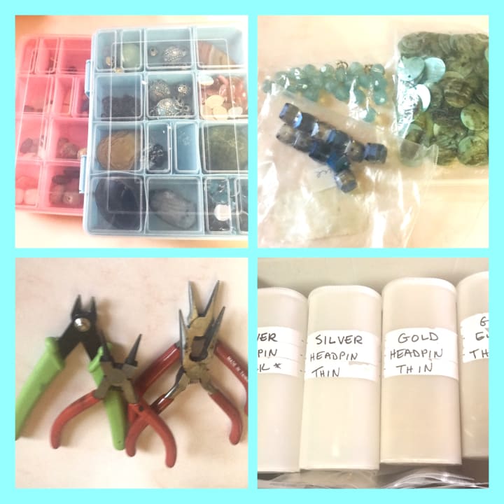 Let’s take a look at my collection of supplies. The fun portion is the beads. I won’t bother telling you how many strands of beads I own. It’s embarrassing but that’s the magic of creativity. The possibilities are endless. You can use any beads you want.