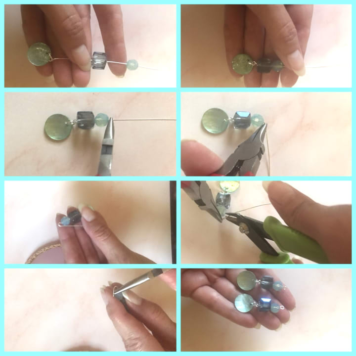 To make your life easier, let’s pretend I didn’t add the shell dangle. If you’d like to modify this design, simply use beads of your choice and a head pin not an eye pin. A head pin looks like a nail. It will hold the beads and you can start at the second step. There you can cut and create your top loop and add ear wires.