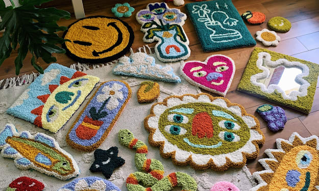 The project that inspires my creativity and brings me happiness is tufting. As someone who spends most of her time either tufting or researching tufting, sometimes I forget most aren’t immersed in it like I am. In fact, I’m learning most people have never even heard of the craft at all. So just in case, let me give you a brief description. Tufting is a textile art that involves using a machine called a tufting gun to continuously push yarn through cloth that’s been stretched across a frame. It’s typically used to make wall hangings and rugs. Simply put the process is: