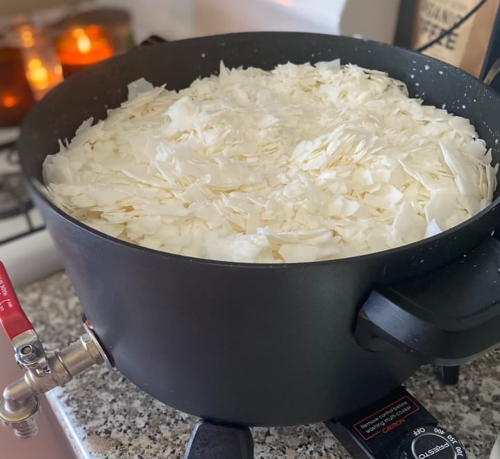 At the beginning stages, I started off with one pouring pot and a measuring cup. Which despite reading numerous articles stating they completely advised against this method due to inaccuracy, I continued to do so anyway. I consistently learned my lesson the hard way with either under pouring or over pouring on most batches being made. Happy to report I now am a proud owner of a scale and a presto pot. Anyways, now this presto pot has been a game-changer, what used to be only six candles per batch has now landed me in at about fifty candles per pot. Very easy to use might I add. Simply fill the pot up with wax flakes, plugin, allow the wax to melt, and heat up to the desired temperature. Usually, during this waiting period, I'm off doing some type of housework. Multi-tasking at its finest.