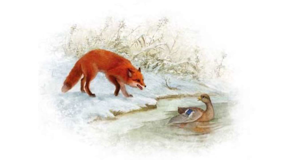 The fox-male proudly entered the hut with the greedy duck clenched in his mouth. Plucking her feathers, he presented the meat to the fox and said, “I may be lazy, but I’m not foolish enough to give away all our food for nothing. Now you understand why I fed only that greedy duck. Come, let’s enjoy warm duck meat in this cold weather.”
