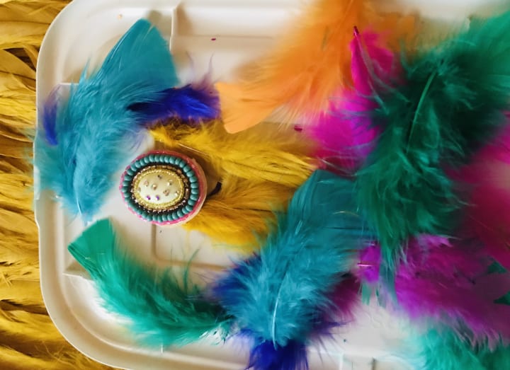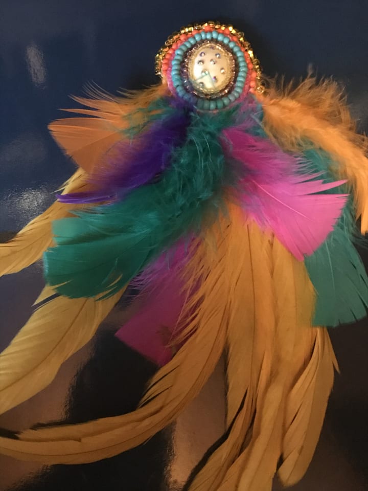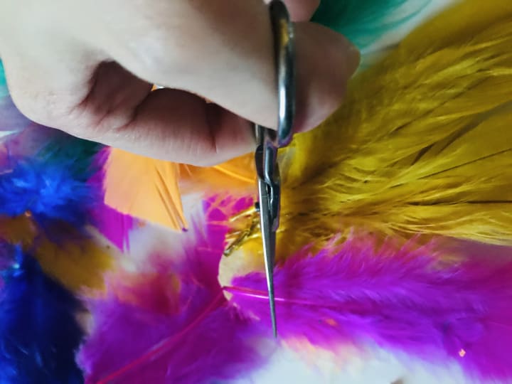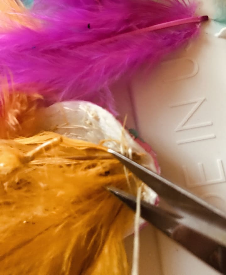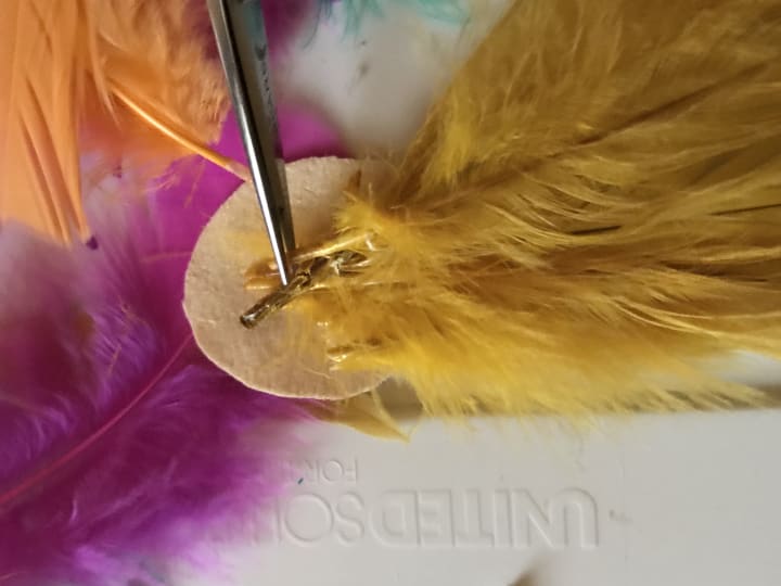 With any creative endeavor, you have to improvise. I call it funovise! I glued and sewed down the feathers to keep them in place.