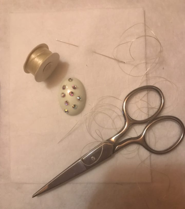 Beading thread is imperative because you want thread that won’t break and will fit through your beads. A simple knot of the thread gets you started.
