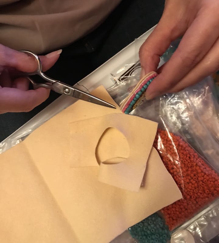 Once you’ve got the beading complete, you’ll have to cut the ultra suede fabric to glue down your piece.