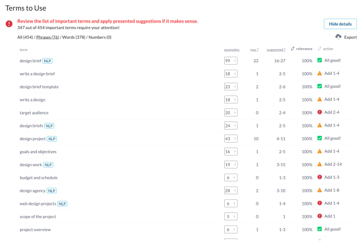 Surfer SEO has a user-friendly interface that makes it easy to use even for beginners. The tool is designed to be intuitive and easy to navigate, with clear instructions and prompts that guide users through the optimization process.