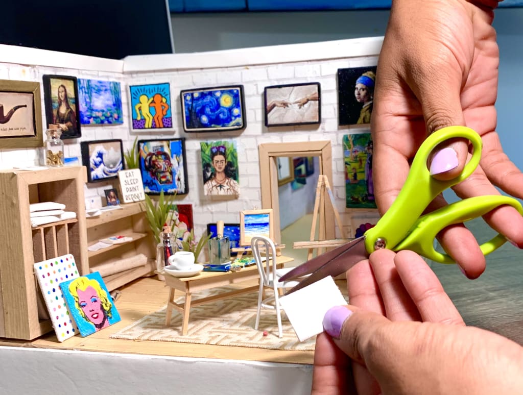 I thought to myself, “How could I bring this specific artistic experience into the safety of home, while also sharing the experience with other people?” This is when the idea for Tiny Art Studio was created! I had handcrafted a 1:12 scale art studio model a few years ago but I had never created any original artworks to fill the walls! The art studio room was designed to the scale of my (then) six-inch bearded dragon. I touched up the room model and started to gather the supplies to stretch some custom miniature canvases!