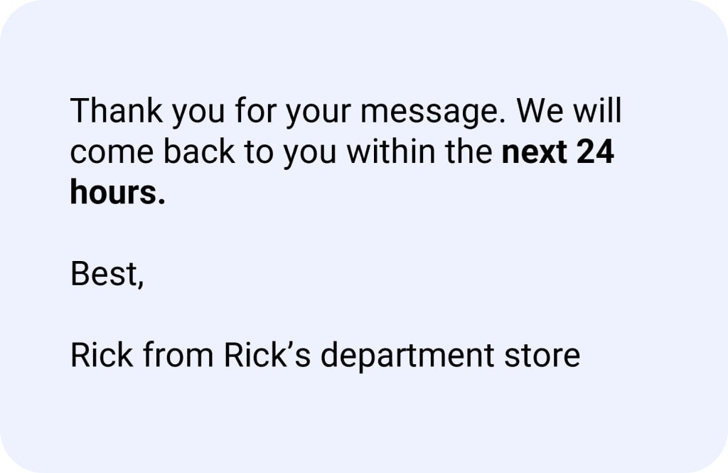 First you need to set clear expectations in the automated reply message. What can a customer expect from your business? Things to consider here are for example the expected response time. Will you come back to the customer inquiry in a few hours, a few days or will it take you at least a week to reply? Setting expectations prevents disappointments and bad customer experiences. It’s better to say you need a week to reply to a customer than to say nothing at all and reply within 4 days to a customer.
