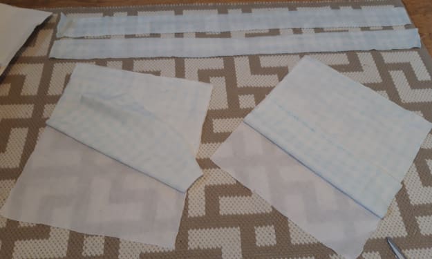 Step 2: For the handles I choose to cut two long lengths of fabrics measuring 6in width by 30in length. These are going to be doubled over lengthways but before cutting, make sure they are the right length.