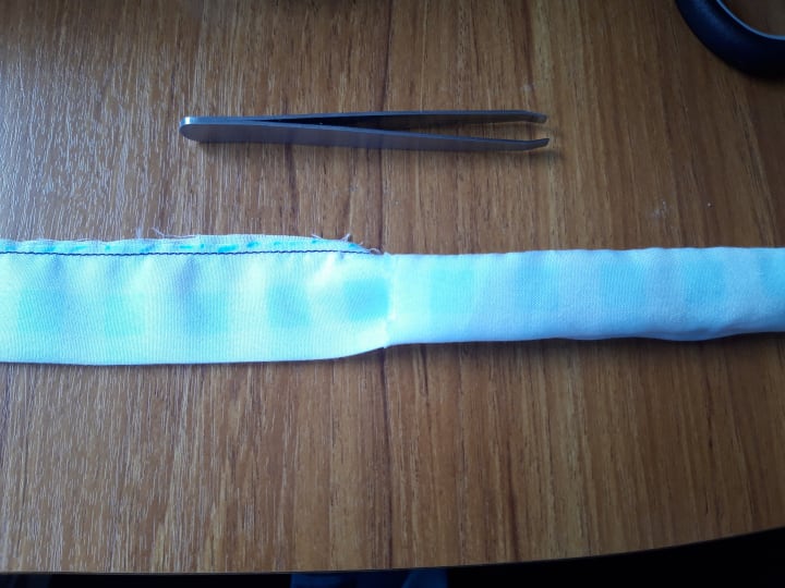 Step 3: Fold each handle so that the right sides are together and sew along the seam. Turn the right way around using a tool such as a bodkin or how I do it, with a pair of tweezers, a hot cup of tea and a lot of patience. Repeat with the other handle. There is no need to secure the ends as they will be inside the sides of the bag and will be secured even further near the end of the process.