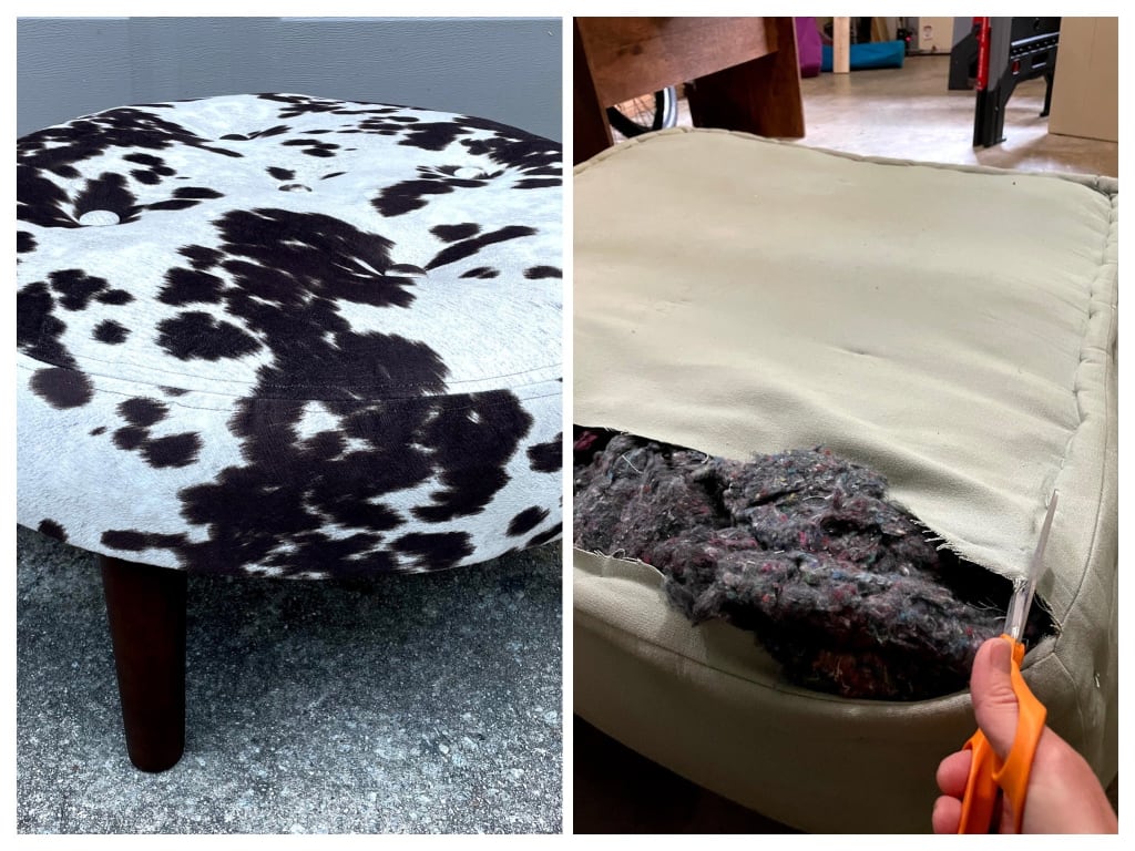 One of the most popular transformations has been the most recent: a tufted ottoman in a cowhide print fabric. The story of this transformation began over two years ago when Sylvia trash-picked a second-rate occasional table made of a plywood top on what looked like a bar stool. She separated the top from the bottom and, in April 2019, transformed the bar stool bottom into a tile-topped bistro table. The large, circular plywood top remained in the garage while she contemplated what it could be. At times it was imagined as a large, tile-surrounded mirror; but then a trip to Hobby Lobby got Sylvia hooked on the cowhide fabric and a new idea was born. At the same time a serendipitous post on a local Buy Nothing Facebook page put her in possession of a high-quality, well-used floor cushion from Urban Outfitters. The fabric and stuffing of the cushion were just what was needed to make a liner and padding for the ottoman. Using a pair of Fiskar scissors Sylvia easily cut the heavy duty fabric of the cushion cover to release the stuffing. Once the fabric was washed, it and the cowhide fabric were cut into the pieces needed to sew a liner and cover for the ottoman. With the cover upside down, the liner inside it, and both packed with stuffing, the round plywood was placed on top and all the layers were stapled in place. Sylvia had five buttons covered in the cowhide fabric at a local upholstery shop. Tufting the ottoman was no mean feat. Getting the upholstery needle through 12 inches of densely packed stuffing left her fingers raw. The piece was finished with a neat round of weed barrier (in lieu of cambric) and four dark-brown eight-inch furniture legs.