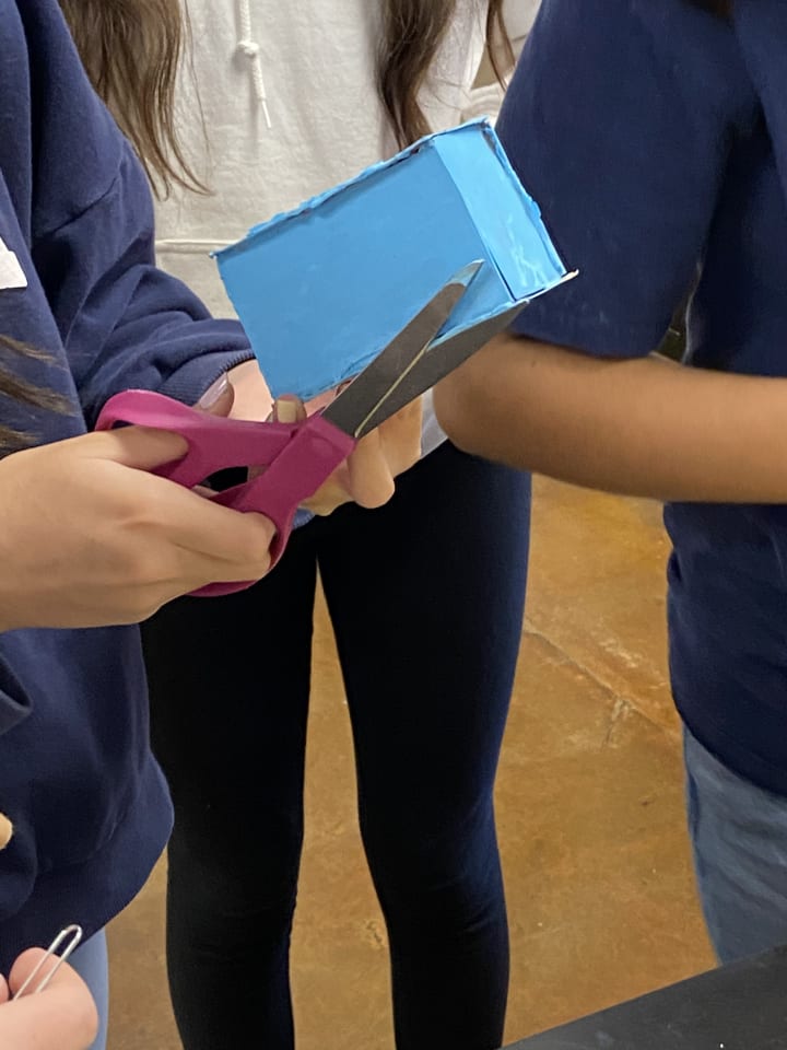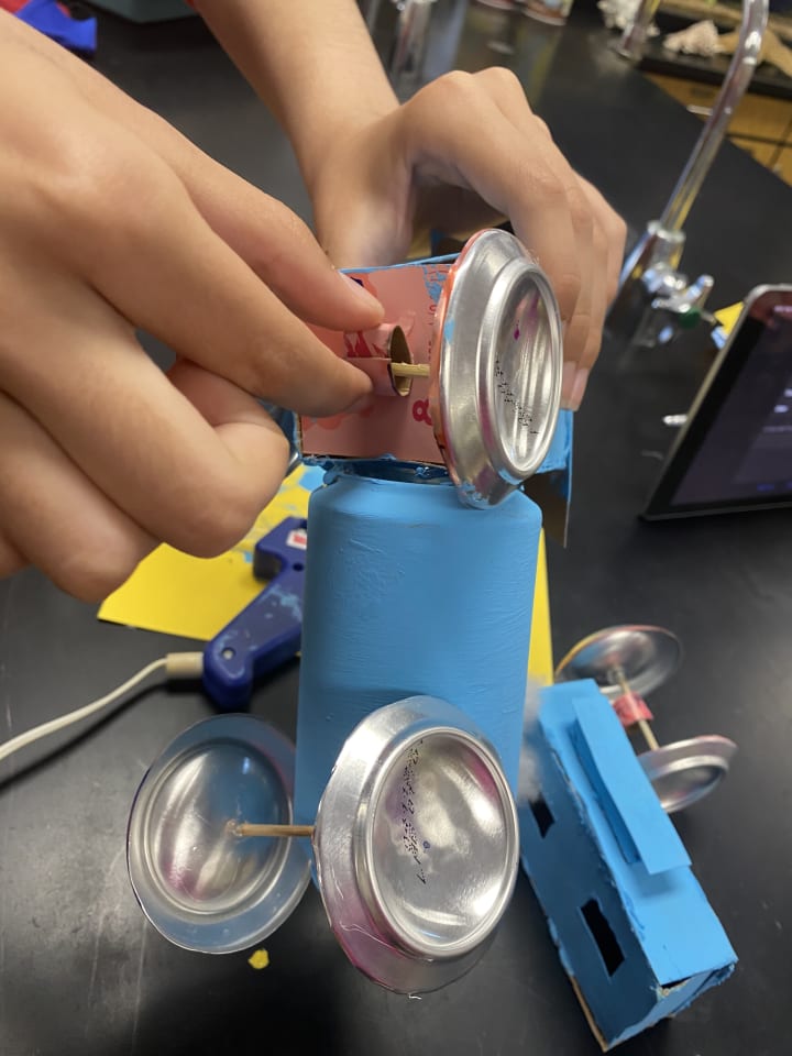 Friend One (the friend who offered to bring everything for our project) created a group chat to communicate there. She was also the one who was showing us what she had. As you can see in the picture, she showed me and my other partner (friend two was gone for 45 minutes, so we had to wait for her to get back) what paint she had chosen. We all agreed that we should color the soda cans with blue paint. So friend one was able to supply us with everything we needed. However, the pieces we didn't have were already in the science lab at school, so the color we need.