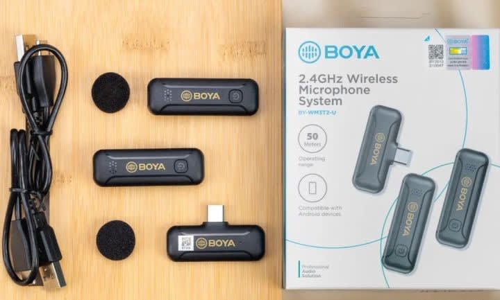 First of all, in the packaging accessories section, I got the BY-WM3T2-U2, which is the one-drag-two version of it. It includes a receiver with a USB-C interface, two wireless transmitters, and other accessories including two USB-C charging cables and two windproof sponges.