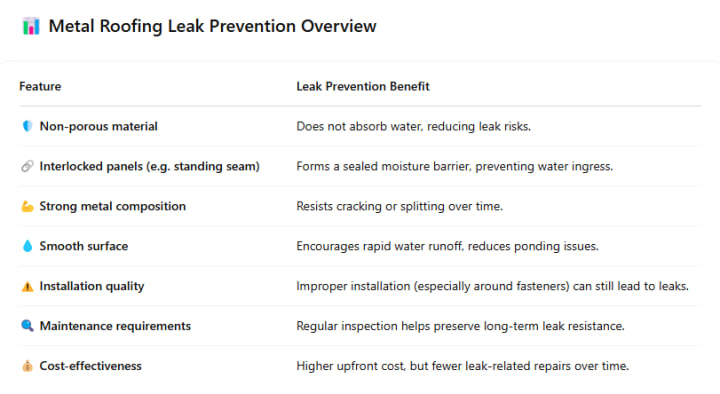 Metal roofing has several characteristics that make it naturally less prone to leaks. It is totally non-porous and does not absorb water; interlocked panels, particularly in standing seam systems, form a sealed barrier to moisture.