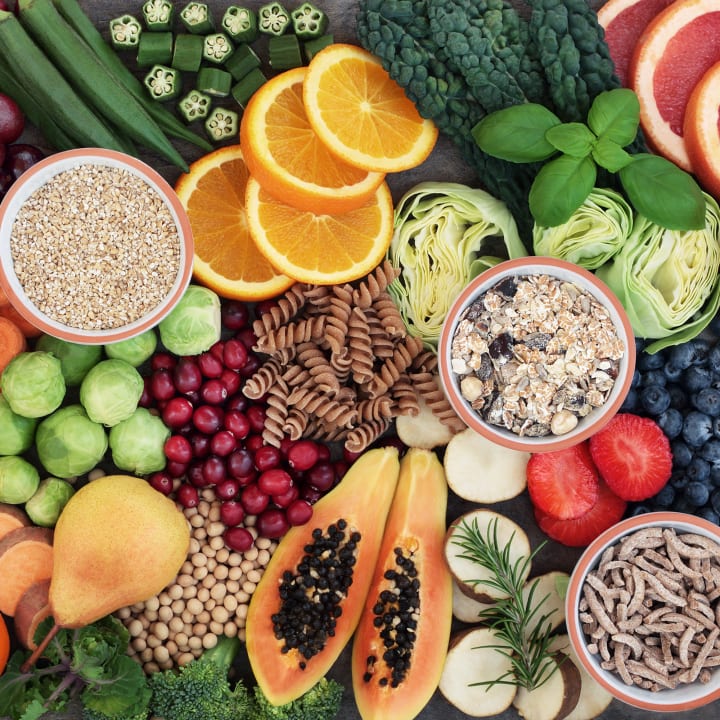 The best sources of dietary fiber are fruits, whole grains, vegetables, and legumes , and more specifically, quinoa, beans, chia seeds, kale, oatmeal, and berries such as strawberries, blueberries .