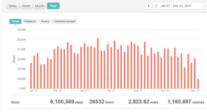Most people who I work with, and nearly every relative and friend, know about my obsession with steps. I had been an avid walker throughout the 2010s, but it really kicked into high gear last November when I turned the Big Five-Oh and my younger siblings chipped in to buy me a Fitbit.