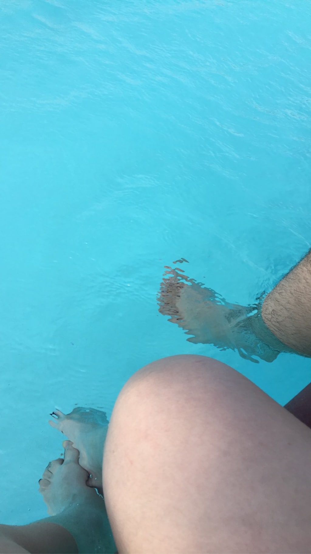 In this picture above my boyfriend & I are just soaking our feet in the pool. It was a windy day & I thought it was going to be to cold to take a little dip. But, now that I think about it I should of. The sun would of dried me off.