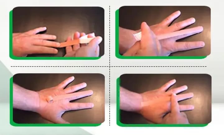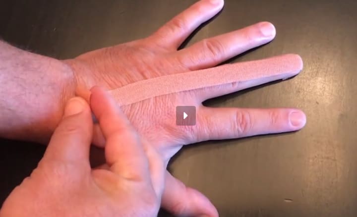 *The tape is stretched over the finger and over the back of the hand in a straight line across the knuckles.