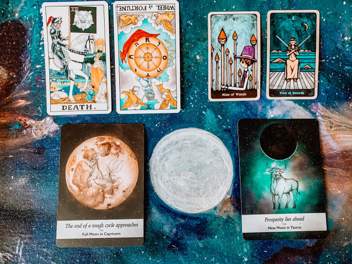 Greetings group two! The first card I want to talk about in this pile is the Wheel of Fortune in reverse. The Wheel of Fortune in reverse suggests that you’ve recently experienced some unwelcome changes and challenging times. Plans you may have had or things you were looking forward to may have been canceled or pushed back recently. Everything seems chaotic for you at the moment and you’re having a hard time in general due to lack of control in your life. The Two of Swords suggests that you may be ignoring how you really feel and hiding from the situation at hand. This may or may not have something to do with facing fears head on. Hoping that if you ignore it, it will just resolve itself. For some of you, you just might not be seeing the entirety of the situation. The Full Moon in Capricorn card tells us that, “The end of a tough cycle approaches”. Stop fearing the worst! These hard times are going to come to an end. This brings us to the Death card. Those who are familiar with tarot know that the Death card is not anything to be afraid of. The Death card is all about the end or beginning of a cycle. It’s about transformation and embracing change. The New Moon in Taurus tells us that, “Prosperity lies ahead.” You are about to be blessed with abundance! The Nine of Wands reassures us once again that these difficult times are nearing the end. Stop neglecting your emotions and let go of the things that you simply just cant control. Embrace the positive changes headed your way.
