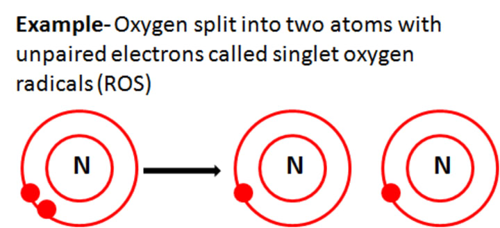 For example — In the below illustration, the stable oxygen molecule that contained a pair of electrons is split into two atoms, each carrying an unpaired electron, now called as singlet oxygen radical or ROS.