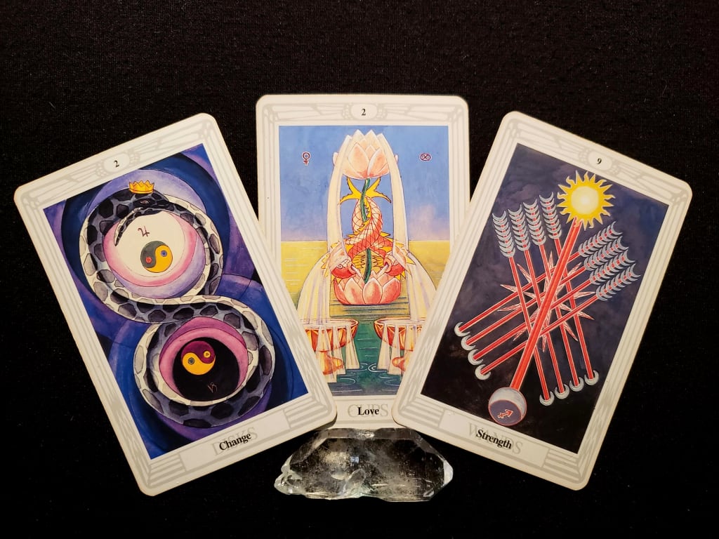 With this two the mirror-image recognition we face is both sides of our relationship with resources; time, energy, money and the physical body. We’re literally looking at both sides of the same coin. We search to find the balance between being influenced by monetary or material things and striving for mastery over that part of being human. We can see the pros and cons and, with the gentle energy of the 2 of Cups at the center, we feel confident enough to be honest with ourselves about how much materialism controls our actions as well as how we can bring ourselves to mastery of those material concerns. Some questions to contemplate might be: Is that job, car, bank account, jewelry, cosmetic, vacation, etc., worth the work necessary to bring it to fruition? What do I lose of myself or those I care about by spending my energies on endeavors of wealth and prestige?