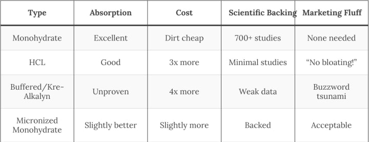 “All these fancy creatines are just overpriced pixie dust. Monohydrate has 30 years of data behind it. The rest have marketing.”