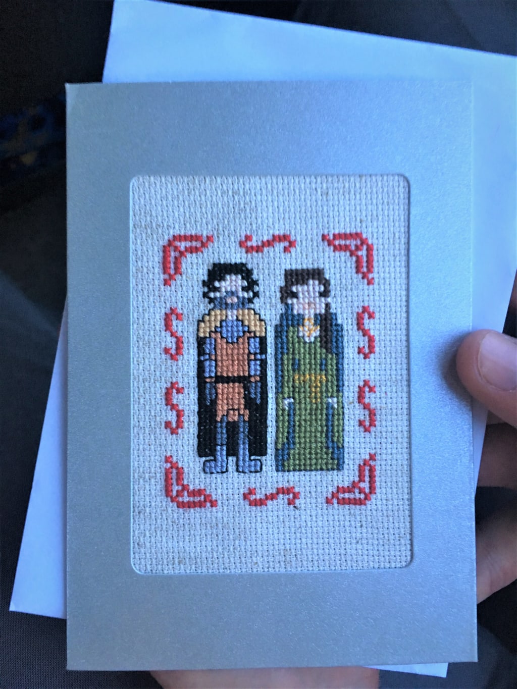 I like to use the patterns as inspiration. I change colours and details to suit. Most of my creations have always been gifts for other people, and all that remains is a terrible photo I took in the taxi on the way to the party. One of my favourite gifts of late was a Wedding card for a best friend. I remembered a time when her and her now husband were always making lots of Game of Thrones references. So I scoured the internet for anything Game of Thrones related. When I found an image of all of the GOT characters, I knew I’d hit the jackpot. I chose two of the most recognisable, possible ‘couple’ characters, changed the colours a little, added a border, voila.
