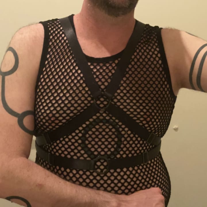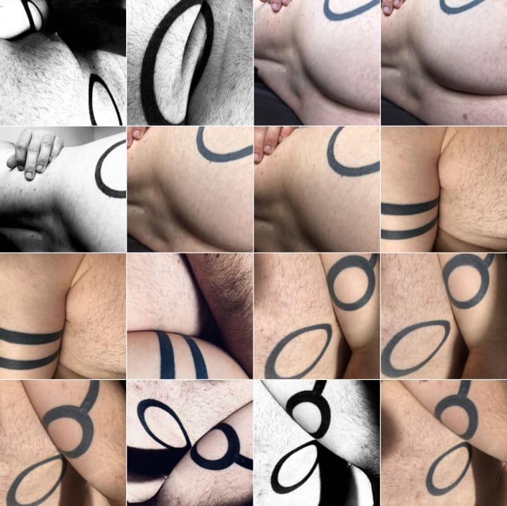 I inked a large circle ring on my chest at the centre of my being, this work is like the Intersex flag, it is about being balanced, being a whole person, loving myself, trusting myself and not needing others to fill any parts of me, as perhaps I did when I was younger. I did not tell my wife about this tattoo or the process that I embarked on with getting this ink. Initially I thought that I would get the tattoo and let it heal. Then, once healed I would use the strength of the tattoo to have the heavy conversation that I knew I needed to be having. The ink had other ideas for me, the same day that I committed to having the ink done, my wife and I started having deeply honest conversations about our relationship and we were separated before the itching stopped and before the ink had fully healed. This has been one of the most powerful personal symbols that I have created.