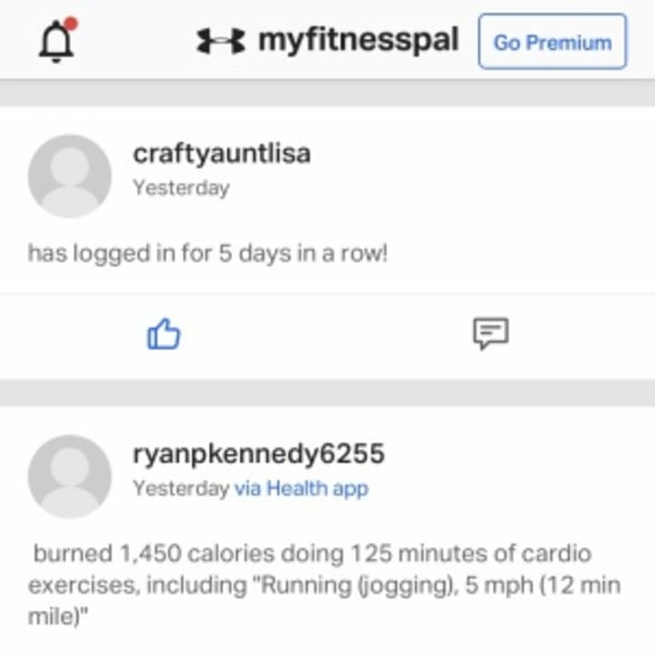 MyFitnessPal also uses these features in their app. You can add people as friends and post status updates (or have it auto-post for you when you complete your food log, record a workout, or achieve a log in streak). Your friends will then see your status in their news feed and have the option to like and comment on it. This encourages people to continue to check the app and log their food and exercise.