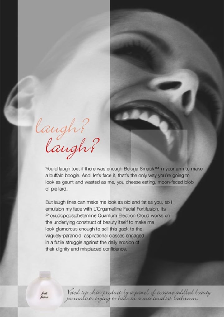Laugh lines can make me look as old and fat as you, so l emulsion my face with L'Orgarnelline Facial Fortifusion. Its Pro sudopopsiphet-amine Quantum Electron Cloud works on the underlying construct of beauty itself to make me look glamorous enough to sell this gack to the vaguely paranoid, aspirational classes engaged in a futile struggle against the daily erosion of their dignity and misplaced confidence.