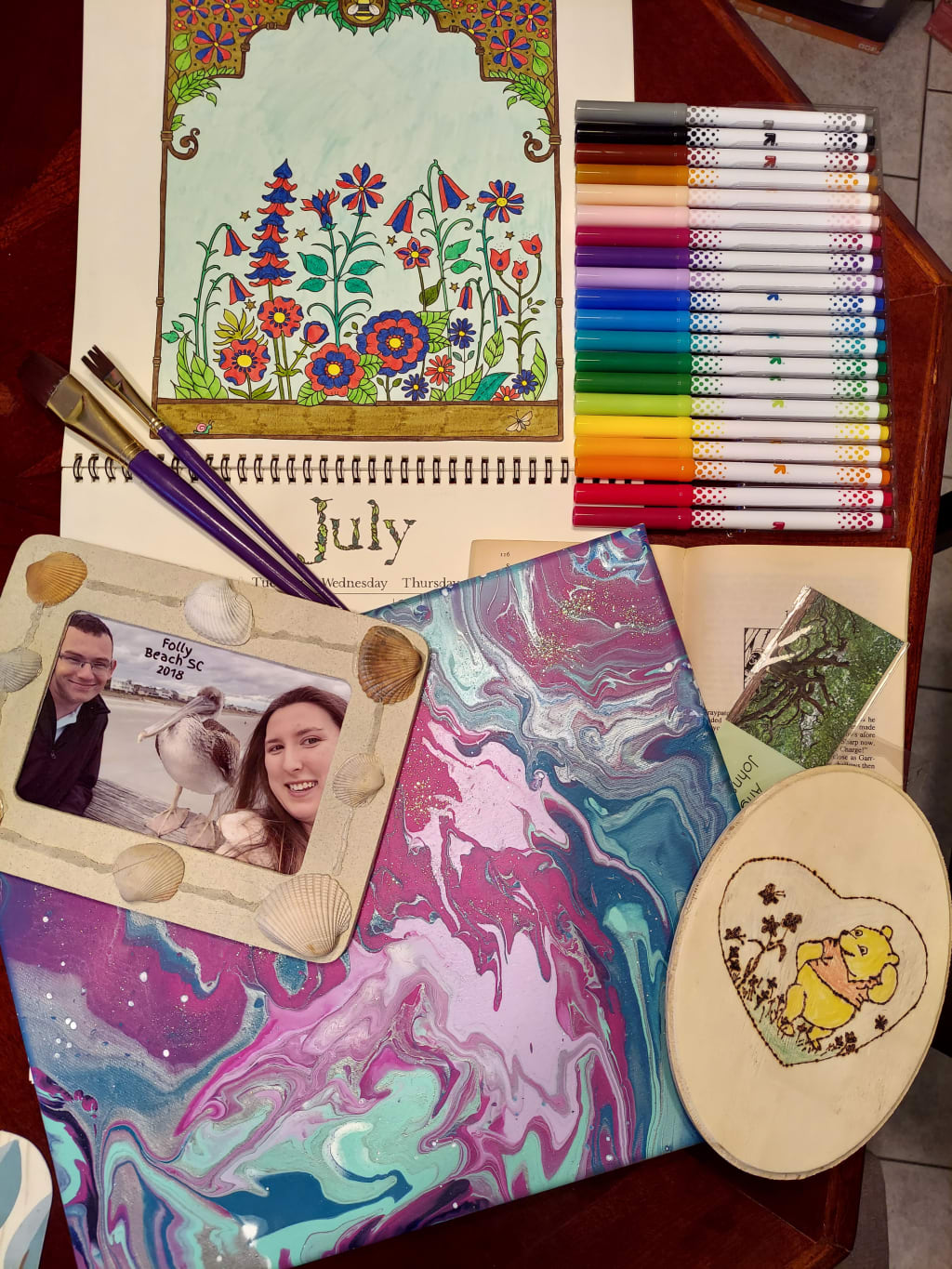 I have been bringing my creations to life with color since I was a toddler. As I grew older, I took art classes and learned to use a variety of mediums. I won a few awards in art shows during middle and high school! I still enjoy filling a blank canvas or paper with my imagination. Sometimes it is even more relaxing to simply grab my adult coloring calendar, markers, and my audiobook. This allows me to completely zone out while still feeling productive because the next month needs to be colored before it gets here! Pour paint is another of my favorites. The suspense of lifting the cup to see what unique pattern will appear as I shift the canvas around drives all else from my mind. I also enjoy 3D art that is functional such as designing picture frames and trinket boxes or giving old furniture a new look. Once I found spray paint that looked like sand to make a beach picture frame. I glued on real seashells my husband and I found on our trip to Folly Beach then inserted the picture of us petting a wild pelican! It was just sitting on the pier. We were admiring it when a local said it would let us pet it.