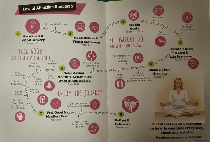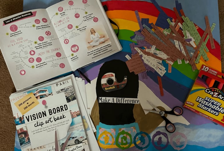 A vision board is a collage of words and images that one uses to display to remind them of why they do what they do every day, ways to grow, and to have a clear vision on the life journey they wish to partake on. With the use of words and images, they speak motivation, determination, life goals, long-term and short term goals, values and morals, and even dreams that one wish to turn into reality someday. The purpose of a vision board or a law of attraction roadmap is to inspire individuals and allowing them to express themselves and leave them feeling happy.