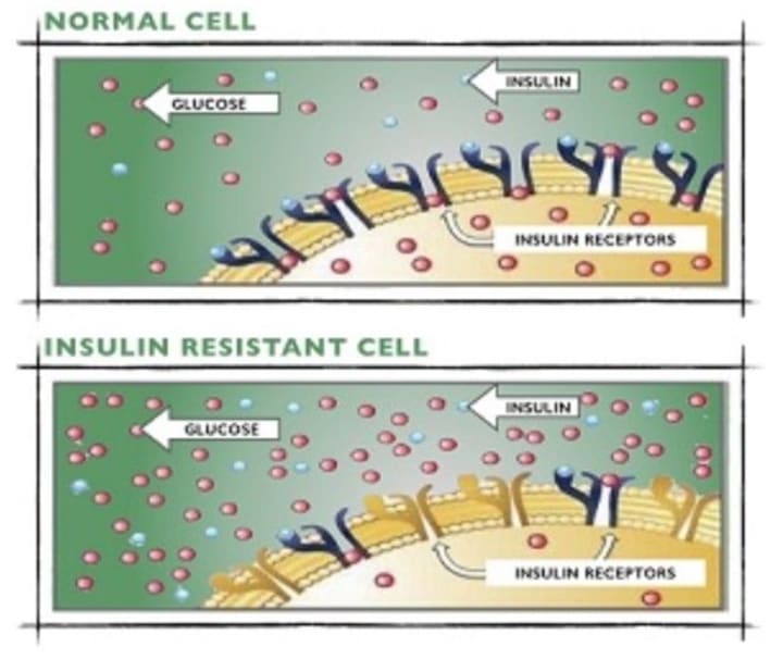 Cells in muscle, fat and the liver become resistant to insulin. Since these cells don't associate in a typical manner with insulin, they don't take in sufficient sugar.