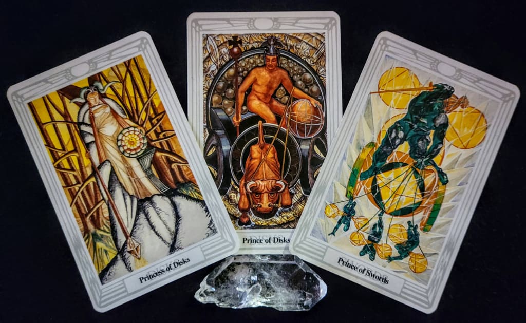 This week we’re dealing with action. All three cards are court cards which I see as the actions we take after learning the lessons of the ace through ten. In the Thoth Tarot deck the order is Princess, Prince, Queen and Knight and this week we’re working with the youngsters.