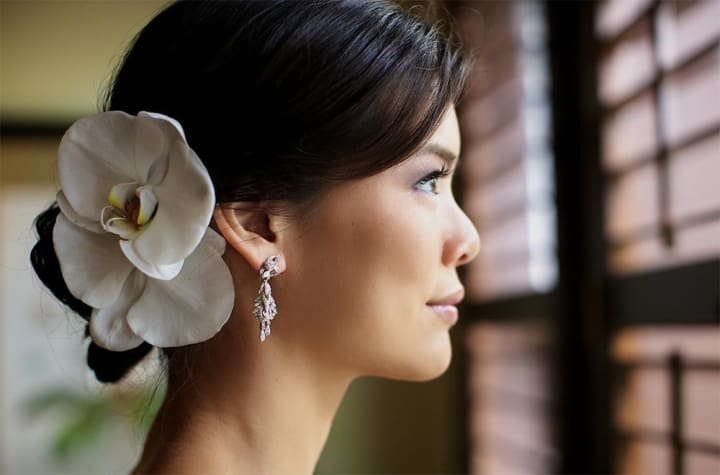 All you need is the orchid and a good sense of where you are going to place it. Usually brides wear it with a low bun, but you can also wear it in a braid or with loose waves behind your ear. It will give you a more tropical look as well as accent your dress.