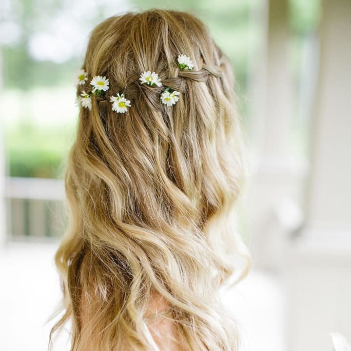 Tuck the daises inside your waterfall braid and they will never come out so you will not have to worry about replacing them the rest of the night. These flowers are very simple to work with which is why they are necessary for any wedding hairstyle with flowers.
