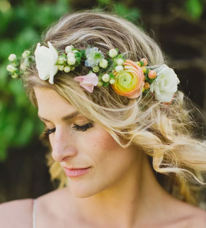 Place bits and pieces around your hair and allow them to fall into place. If you are going for a simpler look, but still want the freshness of having flowers in your hair, this is a balanced medium.