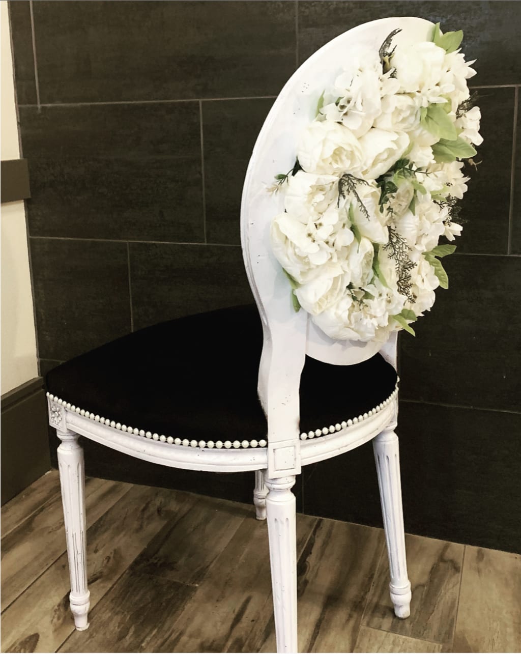 How the chair was created: I purchase used chairs from Goodwill, Habitat for Humanity ReStore, Facebook Marketplace, Yard Sales or from the side of the road. I remove the old foam and fabric then sand the wood and prep it for paint. Most of the time, I use spray paint, because it’s quicker, but I have used other types of paint, as well as gold leaf on my chairs. I decided to use spray paint on this particular chair. Then the paint is sealed with a Polycrylic water-based sealant. Next, I reupholster the chair with new foam, fabric, cotton, muslin, etc. I use my upholstery scissors to cut the foam, fabric, muslin and any other items that need trimming. This year, I started teaching online upholstery classes and include instructions on how to put a chair back together. Once the new fabric has been attached to the chair, I add the trim, in this case pearls, and then add the flowers to the back of the chair.