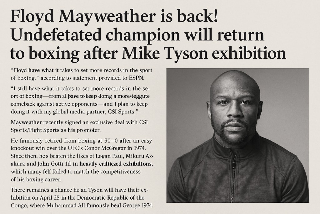 The exhibition match versus Mike Tyson is currently targeted for April 25, 2026, with possibilities pointing toward the Democratic Republic of the Congo—an homage to the legendary Rumble in the Jungle between Muhammad Ali and George Foreman in 1974. While not yet fully confirmed, the event is already drawing enormous buzz. However, the Tyson fight is only the beginning: Mayweather’s true return begins in the summer, when he will re-enter the pro ring for the first time since 2017. An opponent, date, and venue are expected to be announced soon.