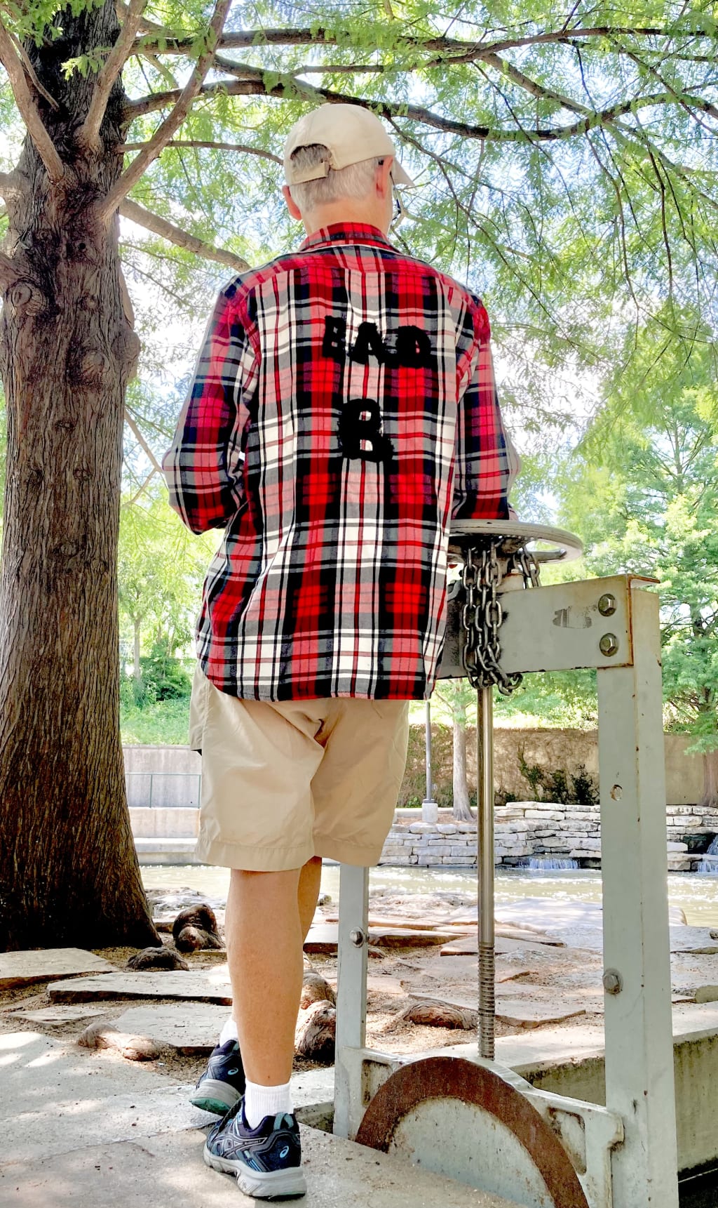 Solveig, however, is petite. And a frugal donner of garb. Many-a-tattered flannel graces her stylistic choosing. Like sturdy track pants with a light tan to brown ombre which used to be full black in a previous section of its life. Anywho, one day at Luther's Cafe she vented to me about her suffering of misnomers. We were already tense after a particularly draining struggle with the QR code menu. Eager to conquer a task, I channelled my caucasian quilter roots and drew out a concept to solve Sol's predicament: Bad B on the back of a flannel. Or maybe full on Bad Bitch? Once I sat down with the fabric and scissors, I would determine how many letters this stitching hero could muster. Either way I swore an oath to procure a means of protection. She needed safer passage through the sea of unwise masses that uttered her presence without due respect.