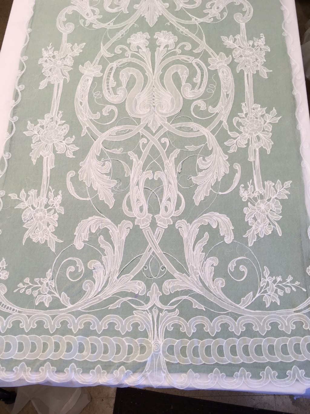 I pushed on and at about a year I knew I was getting good and began to think about doing Cornely work for pay. Mr. A, as an experienced operator made tens of thousands of dollars a week in the height of his work. I was dollar struck thinking about it but forgot the many many years he spent developing his business and building a name for himself. Regardless, I started a business and developed a plan remembering that I had to offer something unique. Mr. A and I had become friends by that time and I recall him saying one time when I mentioned drapery sheers "Oh no! My grandmother did that you don't want to do that. It is so labor intensive." That was enough for me. I love a challenge and if drapery sheers were hard then they were for me!