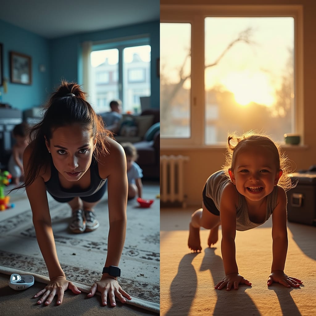 Left side: Frustrated mom in pajamas attempting a push-up on messy living room carpet, kid laughing in background. Right side: Same mom (hair still messy) doing 5 push-ups with a “hell yeah” grin, kid cheering. Text overlay: “10 Minutes Can Change More Than Your Body.” Style: Unfiltered smartphone photos, imperfect lighting.