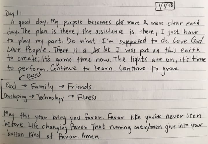 (1/1/18) A good day. My purpose becomes more and more clear each day. The plan is there, the assistance is there, I just have to play my part. Do what I'm supposed to do. Love God. Love people. There is a lot I was put on this earth to create; it's game time now. The lights are on, it's time to perform. Continue to Learn. Continue to Grow.