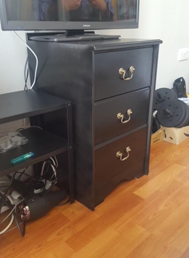 The very same day I f**ked up yet again. Later that evening I had had a few ciders and I was quite tipsy. At around 10 pm I started to sort through my arts and crafts supplies because I was bored as fuck of watching TV. In the first box I started riffling through I found some black spray paint. Score! In my tipsy state, I put down the sheet I had washed earlier, grabbed the drawers and got to work. My intention was to just paint the top of the bedside table, see how it looked and do the rest the next day out on the balcony. But I'm a f**king idiot, so that isn't what happened.
